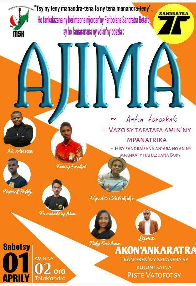 Hotontosaina ny sabotsy 01 Aprily 2023 ho avy izao ao amin'ny efitrano malalaky ny Tranoben'ny Serasera sy ny Kolontsaina eto Vakinankatra (Akon'ankaratra, Piste Vatofotsy) ny hetsika ho fanamarihana an'ireo voalaza ireo. Hanomboka amin'ny roa ora ny fotoana ary nampisalorana ny hoe AJIMA ity seho miavaka ity.