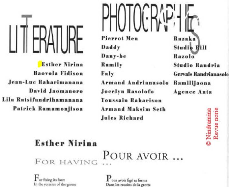 - M Y R (2010). Simple hommage à Esther Nirina (1932 - 25 juin 2004). Tsikaritra ao amin'ny:
