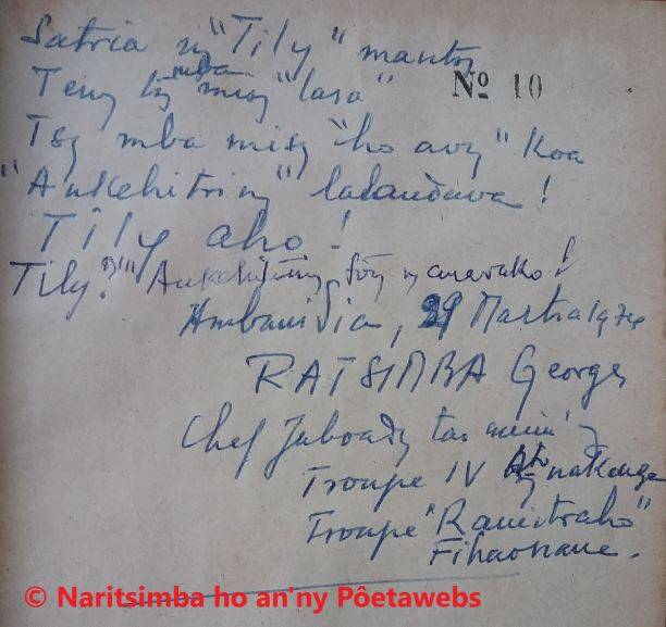 Teo amin'ny faha-19 taonany (1945) Ratsimba Georges no nanomboka nanoratra araka ny hita ao amin'ny bokiny "Rotsirotsy". "Toaka-sigara-loka" no lohatenin'ny tononkalony nivoaka voalohany tamin'ny gazety bokin'ny Skoto tamin'izany.