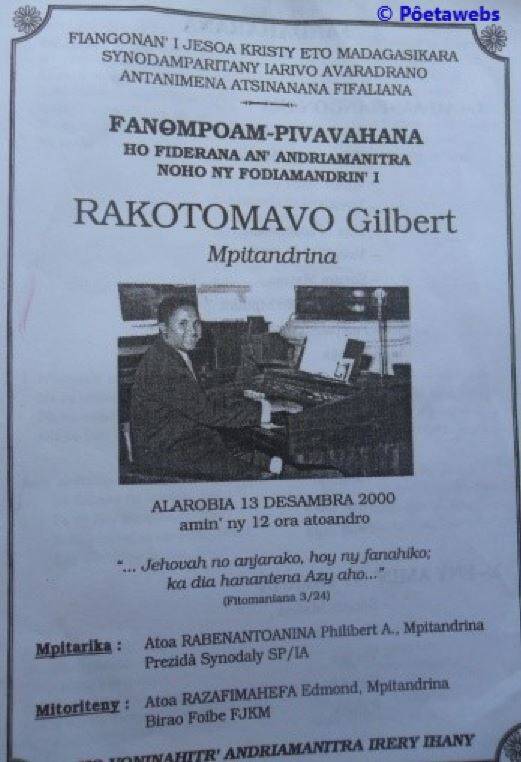 Teraka tao Ankazomanga Antananarivo, ny 17 jolay 1938 Rakotomavo Gilbert. Ny alahady 10 desambra 2000 izay fotoana natokana ho alahadin’ny Mpitandrina sy alahady nitsingerenan’ny faha-15 taona nitandremany ny Fiangonana Protestanta Antanimena Atsinanana kosa izy no nandao ny tany. Tao Ambohimasindray Ambohimanga no nanaterana azy farany.