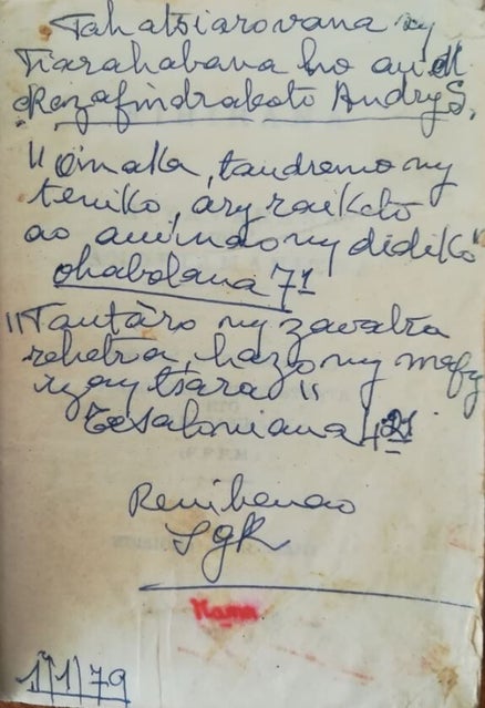 Hafatra napetrak'i Suzy Andry ho an'ny zafikeliny Razafindrakoto Andry Suzanne tamin'ny 1979 tao amin'ny Fihirana natolony azy